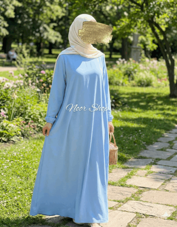Schlichte und elegante Abaya in zartem Himmelblau. Bequem, luftig und ideal für den Alltag bei warmem Wetter.
