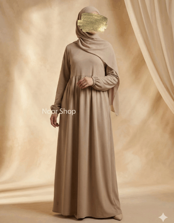 Die elastischen Ärmelabschlüsse setzen dezente Akzente und machen die Abaya besonders praktisch im Alltag. Der neutrale Beigeton passt zu jeder Jahreszeit und lässt sich ideal mit goldenen, braunen oder cremefarbenen Hijabs kombinieren.