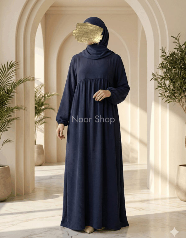 Fließende Abaya in edlem Navy Blau mit dezenter Raffung und elastischen Ärmeln. Perfekt für Alltag, Arbeit, Gebet und stilvolle islamische Outfits.