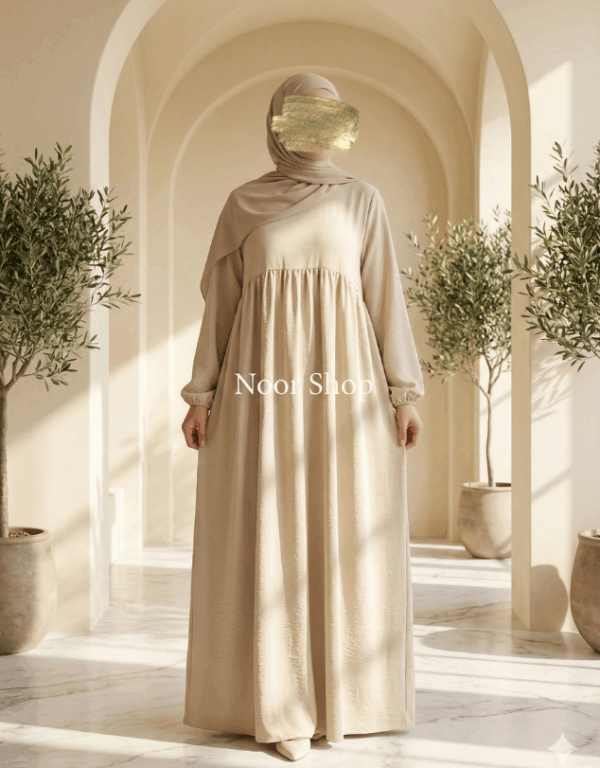 Diese traumhafte Abaya in Creme Beige überzeugt durch ihren weichen, fließenden Stoff und den besonders eleganten Schnitt. Die Absetzung unterhalb der Brust sorgt für eine wunderschöne Silhouette und lässt das Kleid feminin und leicht wirken. Durch die sanfte, warme Farbe strahlt die Abaya Ruhe, Reinheit und Eleganz aus – ideal für Frühling, Sommer und warme Herbsttage.