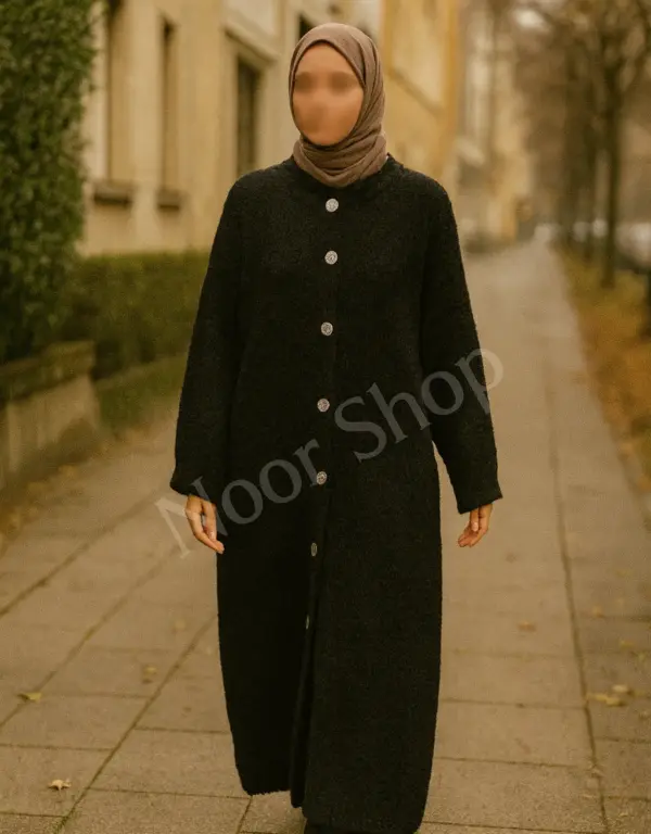 Die hochwertige Stoffstruktur sorgt für Wärme und Komfort, während die dekorativen Knöpfe dem Design eine edle, zeitlose Note verleihen. Durch den dezenten Look lässt sich der Mantel vielseitig kombinieren – ob mit Boots, Abaya, weit geschnittenen Hosen oder klassischen Winter-Outfits.
