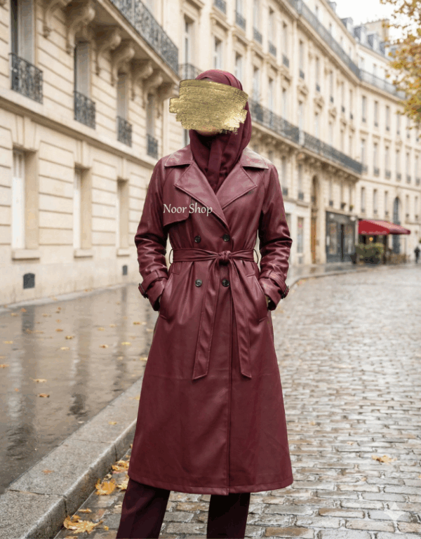 Luxuriöser, wasserabweisender Trenchcoat aus hochwertigem Kunstleder in edlem Bordeaux. Taillierter Schnitt, Bindegürtel und Doppelknopfleiste – perfekt für Herbst, Winter und elegante islamkonforme Outfits.