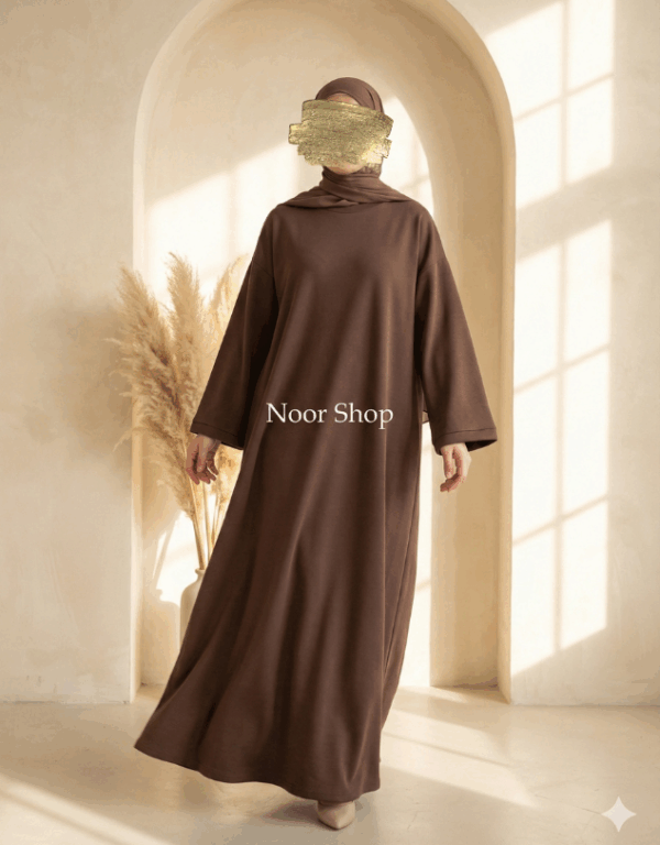 Diese braune Abaya besticht durch ihr schlichtes Design und den langen Schnitt. Perfekt für bescheidene, stilvolle Outfits, bietet sie sowohl Komfort als auch Eleganz.