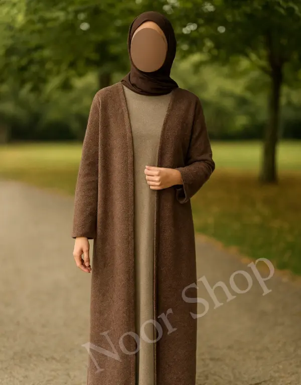 Eleganter langer Cardigan in warmem Braunton. Weiches Material, lockerer Fall, perfekt kombinierbar über Kleidern oder Abayas. Ideal für Alltag, Arbeit oder besondere Anlässe