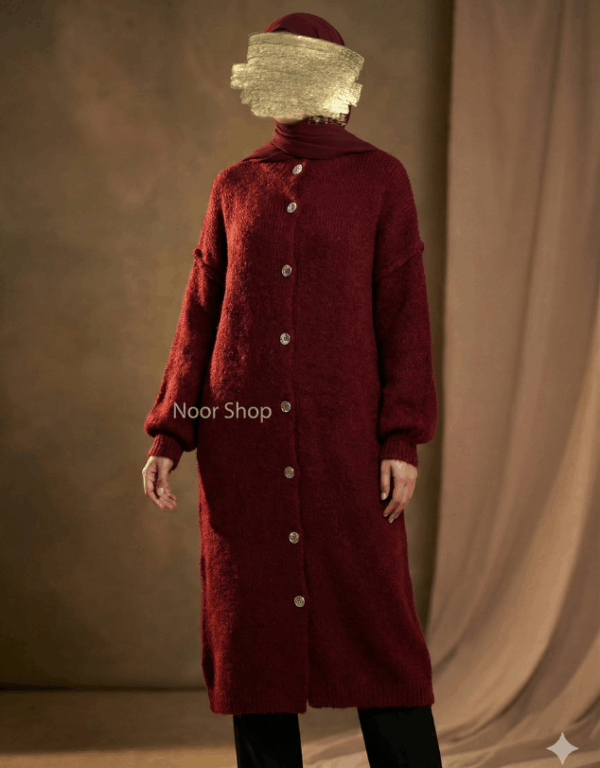 Das tiefe Bordeauxrot wirkt warm, hochwertig und harmoniert wunderbar mit neutralen Hijab-Farben wie Beige, Creme, Braun oder Schwarz. Durch den lockeren Sitz eignet sich der Cardigan ideal zum Layern über Abayas, Longtops oder Zweiteilern.