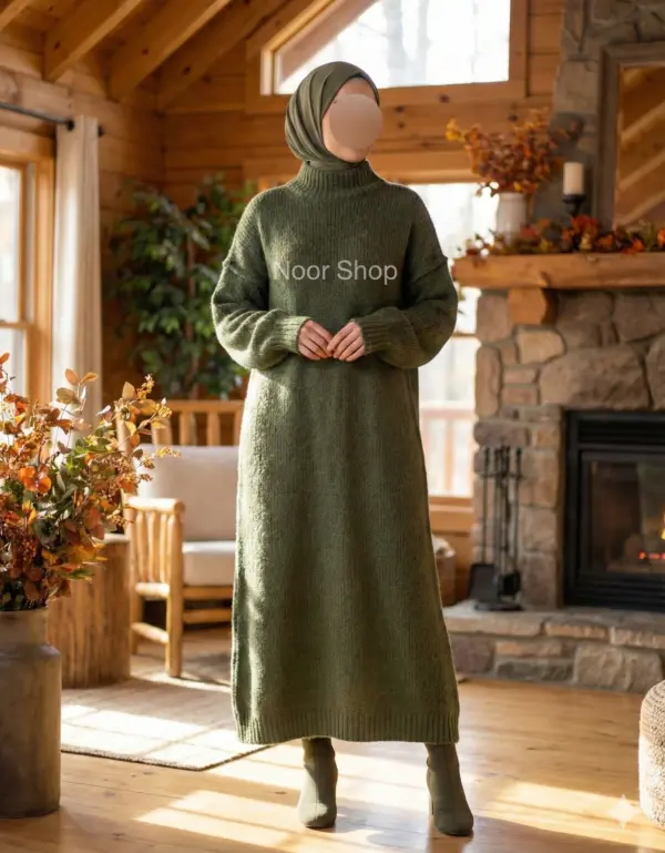 Dieses olivgrüne Strickkleid von Noor Shop vereint Wärme, Bescheidenheit und stilvolle Wintermode. Der weiche Strickstoff hält angenehm warm und fällt locker bis zum Knöchel, wodurch das Kleid eine vollständig bedeckende und zugleich elegante Silhouette schafft.
