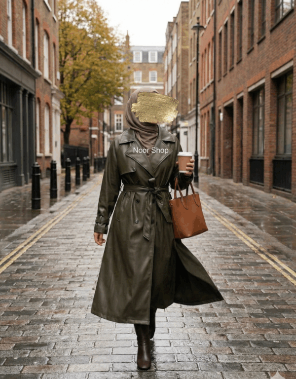 Dieser elegante grüne Trenchcoat für Damen bietet Stil und Komfort. Mit seinem praktischen Gürtel und dem klassischen Design eignet er sich perfekt für kühlere Tage und verleiht Ihrem Outfit eine besondere Note.