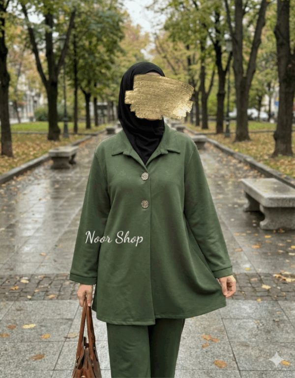 Dieses grüne Zweiteiler-Set vereint Komfort und Stil. Die Bluse mit klassischen Knöpfen und die weite Hose bieten einen eleganten Look, der sowohl im Alltag als auch bei besonderen Anlässen getragen werden kann. Das weiche Material sorgt für einen angenehmen Tragekomfort, während das schlichte Design des Sets für vielseitige Kombinationen sorgt. Eine perfekte Wahl für Damen, die Wert auf Bescheidenheit und stilvolle Eleganz legen.