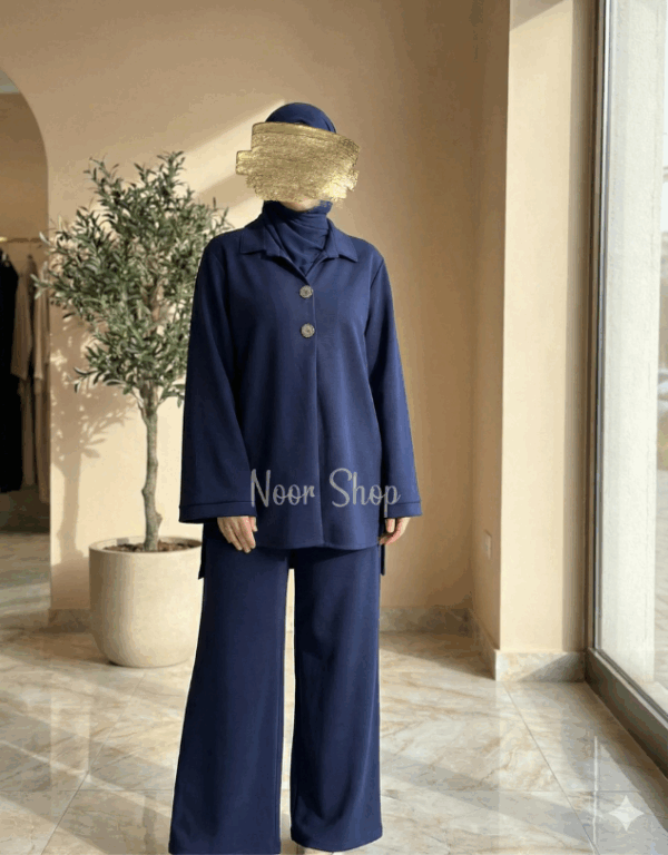 Dieses navyblaue Zweiteiler-Set bietet Ihnen sowohl Komfort als auch Stil. Die Bluse mit klassischen Knöpfen und die weite Hose verleihen dem Set eine elegante, aber entspannte Ausstrahlung. Das weiche Material sorgt für angenehmen Tragekomfort, während das schlichte Design eine Vielzahl an Kombinationsmöglichkeiten bietet. Ob für den Alltag oder für formelle Veranstaltungen, dieses Set ist eine stilvolle Wahl, die sowohl Bescheidenheit als auch Eleganz betont.