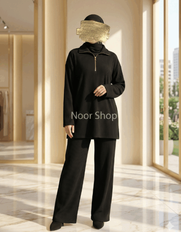 Dieses elegante schwarze Zweiteiler-Set bietet eine perfekte Kombination aus Komfort und Stil. Die Zip-Up Bluse mit langen Ärmeln und die weite Hose bieten einen modernen Look, der sowohl im Alltag als auch bei entspannten Anlässen getragen werden kann. Das weiche Material sorgt für angenehmen Tragekomfort, während das schlichte Design vielseitige Kombinationsmöglichkeiten bietet.