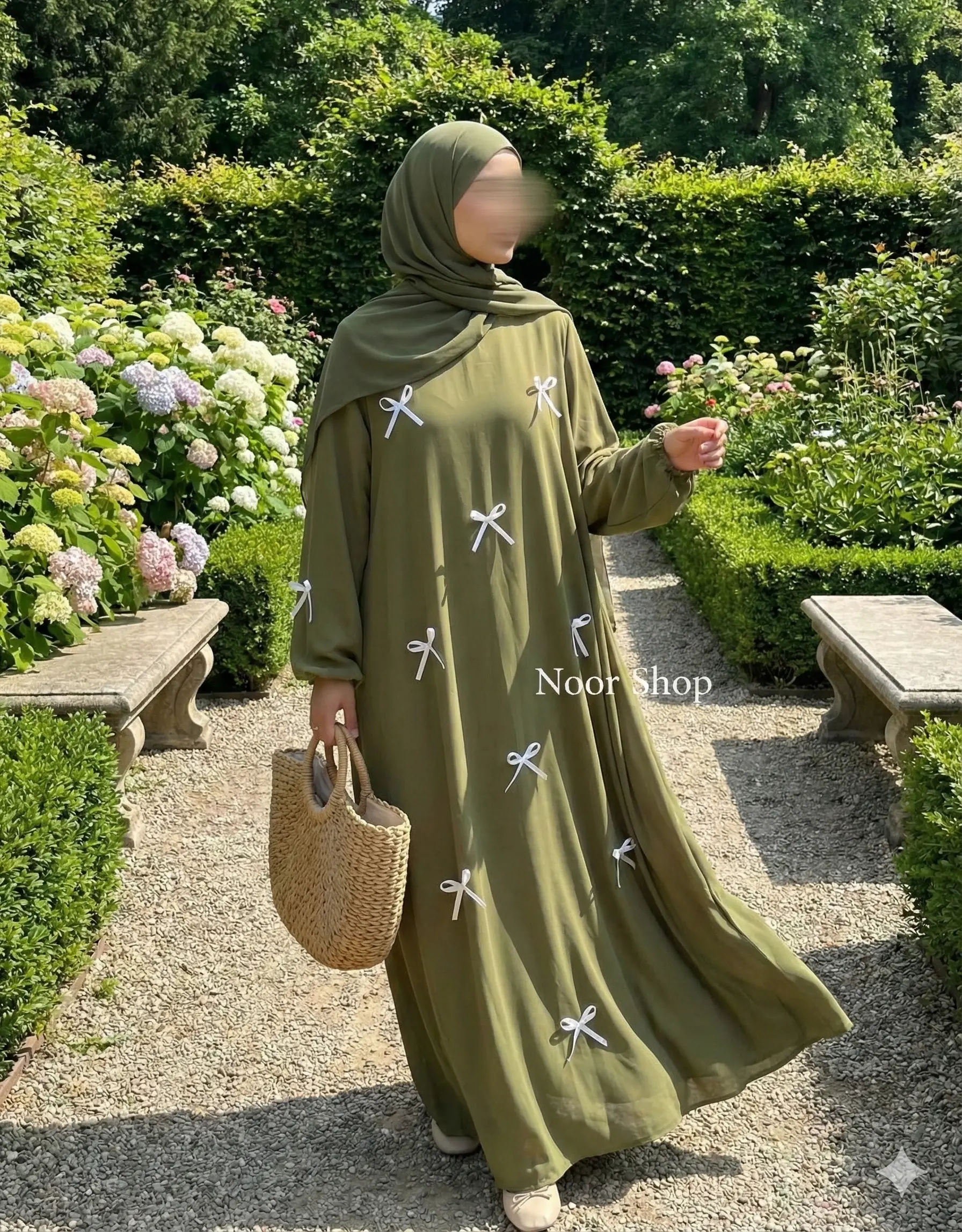 Die olivgrüne Schleifen Abaya von Noor Shop bringt eine feminine und verspielte Note in deine Modest-Garderobe. Die luftige Stoffstruktur sorgt für ein angenehm leichtes Tragegefühl, während der weite Schnitt für vollständige Bedeckung und maximalen Komfort sorgt. Die weißen Schleifen, die dekorativ über die Vorderseite und Ärmel verteilt sind, verleihen dem Kleid einen charmanten, einzigartigen Look.