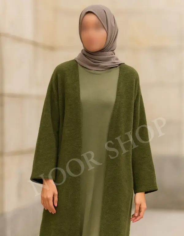 Diese olivgrüne offene Strick-Cardigan aus der Noor Collection vereint Komfort, Stil und Bescheidenheit.