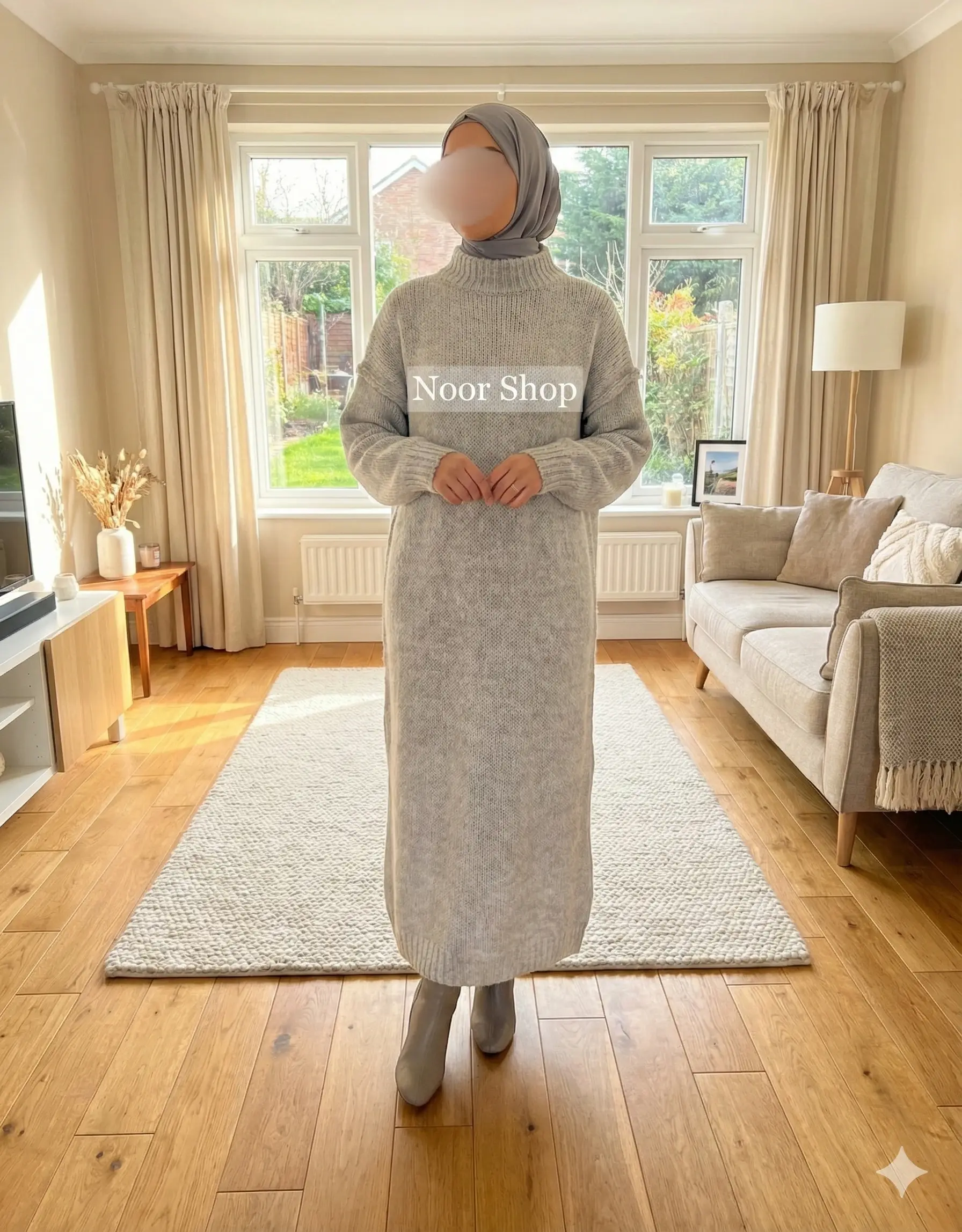 Elegantes graues Strickkleid mit Rollkragen – warm, bequem und ideal für den Winter. Perfekt für Modest Fashion Liebhaberinnen.