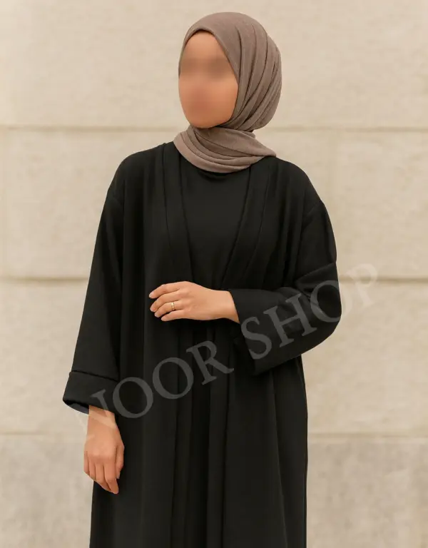 Eleganter schwarzer offener Mantel mit weitem, abaya-inspiriertem Schnitt. Perfekt für muslimische Frauen, die ein dezentes und stilvolles Outfit wünschen. Ideal für Alltag, Beruf oder besondere Anlässe.