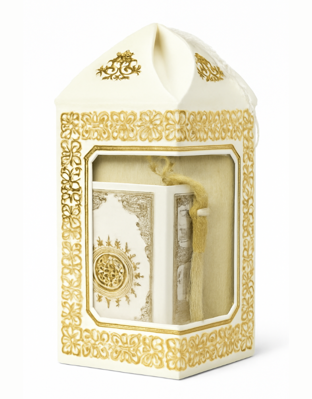 Wunderschöner Qur’an & Gebetsteppich in einer dekorativen Geschenkbox mit feinen Verzierungen. Ideal als Geschenk und für besondere Anlässe.