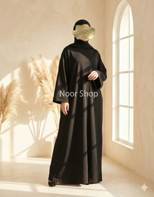 Diese schwarze Basic Abaya kombiniert zeitlose Eleganz mit maximalem Komfort. Der weite, fließende Schnitt sorgt für volle Bedeckung und Bewegungsfreiheit, während das hochwertige Material sanft fällt und eine sehr schöne Silhouette formt.