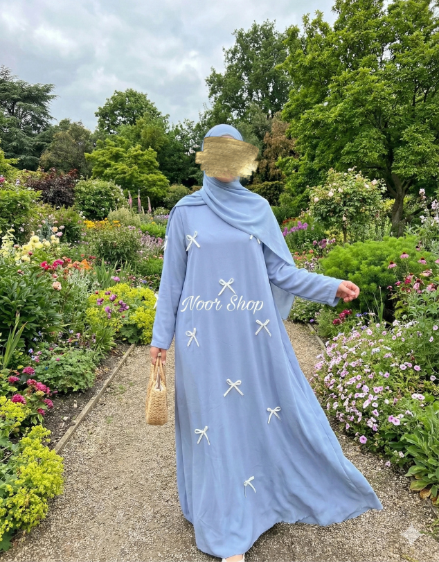 Leichte, fließende Satin-Abaya in zartem Babyblau mit feinen Schleifendetails. Perfekt für Frühling, Sommer, Spaziergänge, besondere Anlässe und feminine muslimische Outfits.
