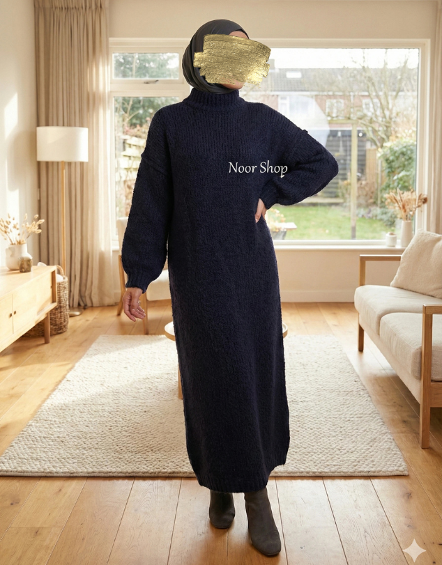Dieses Winter-Strickkleid in elegantem Navy vereint Wärme, Komfort und stilvolle Modest Fashion. Der weiche Winterstrick sorgt dafür, dass du selbst an kalten Tagen warm eingepackt bist, während der lockere Schnitt eine wunderschöne, dezente Silhouette schafft.