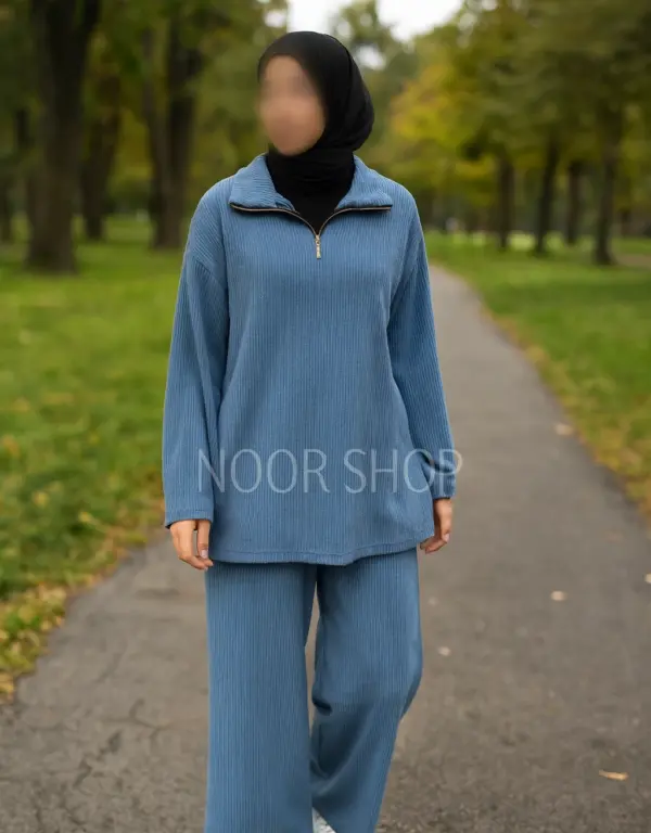 Ein gemütlicher Rippstrick Zweiteiler in zeitlosem Blau: weiter Zipper-Pullover und locker fallende Hose für maximalen Komfort und volle Bedeckung. Perfekt für entspannte Tage, Spaziergänge oder den Alltag, ideal kombinierbar mit Hijab und Sneakern.