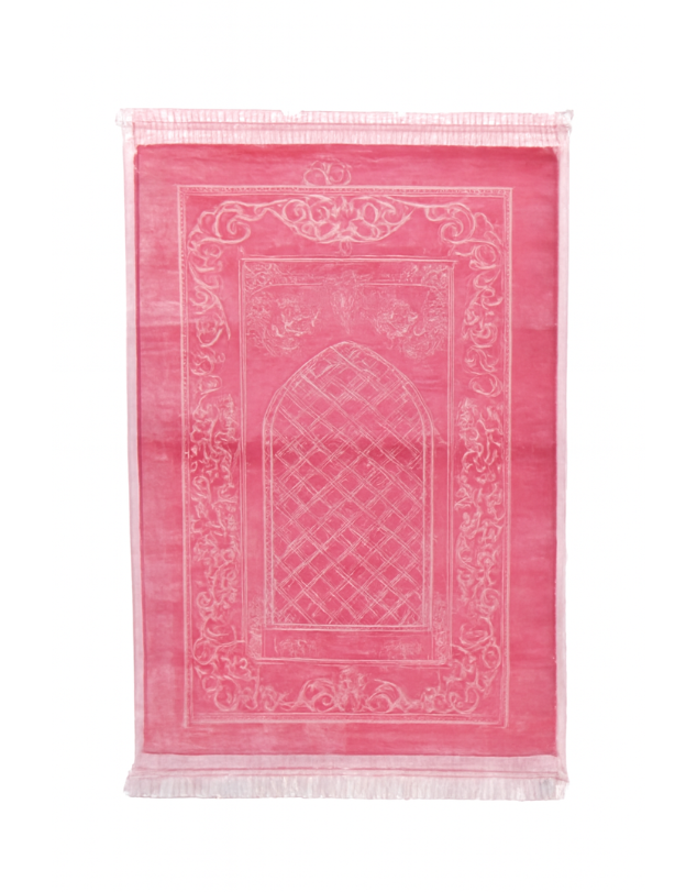 Dieser rosa Samt Gebetsteppich vereint Komfort, Eleganz und eine angenehm weiche Oberfläche. Das feine Prägungsmuster sowie die hochwertigen Fransen am oberen und unteren Rand verleihen der Musalla einen edlen und ruhigen Look, perfekt für das tägliche Gebet zu Hause, unterwegs oder als Geschenk.