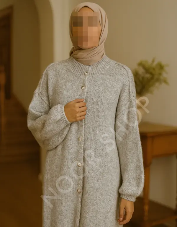 Ein weicher, eleganter Maxi-Strickcardigan in einem hellen Grauton. Perfekt für hijabfreundliche Outfits, ideal für Herbst, Winter und Übergangszeiten.
