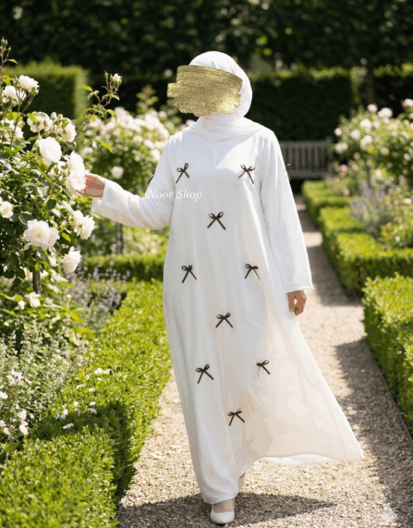 Elegante weiße Abaya mit feinen braunen Schleifendetails – ein leichter, edler Look für besondere Anlässe und den Alltag.