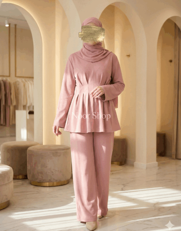 Modernes, edles Zweiteiler-Set in Rosé mit tailliertem Falten-Top und fließender Hose. Perfekt für Alltag, Events und elegante Modest Fashion Looks.