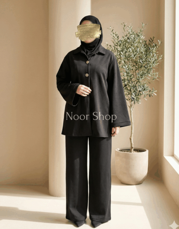 Schickes, locker fallendes Zweiteiler-Set in tiefem Schwarz. Mit elegantem Oberteil, goldfarbenen Knöpfen und weiter Hose – ideal für Alltag, Arbeit, Events und moderne islamkonforme Outfits.